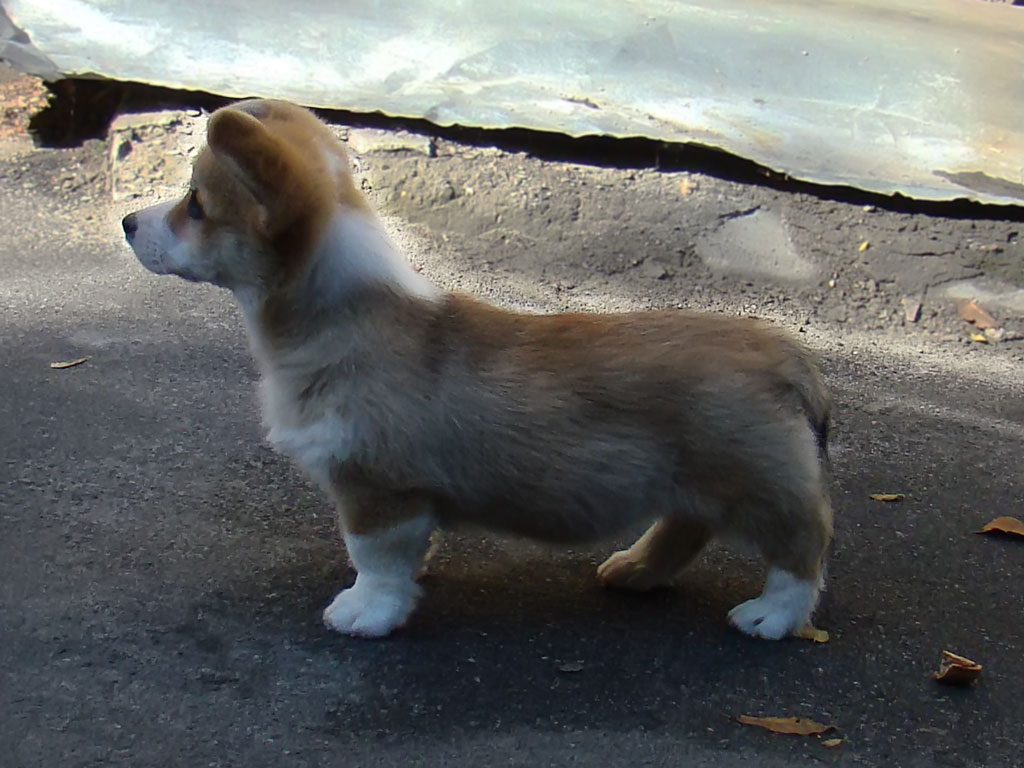 Gwendolen Iz Doma na Holme - рыже-белая девочка. Среднего размера, очень объемная, подвижная - как теннисный мячик. Голова крупная, с хорошо выраженным стопом и мощным щипцом, красивого выхода шея, грудная клетка широкая, поясница короткая. Гвен прек-расно одета, к тому же у нее очень нарядно, симметрично расположены белые метки - и воротник, и маска. Это, конечно, не имеет существенного значения при экспертизе вельш корги пемброка на выставке, но собаку украшает. И характер гармонирует с экстерьером - веселая бойкая, игривая, такой заводной апельсинчик. Гвен уже перехала в свою новую семью в Киеве.