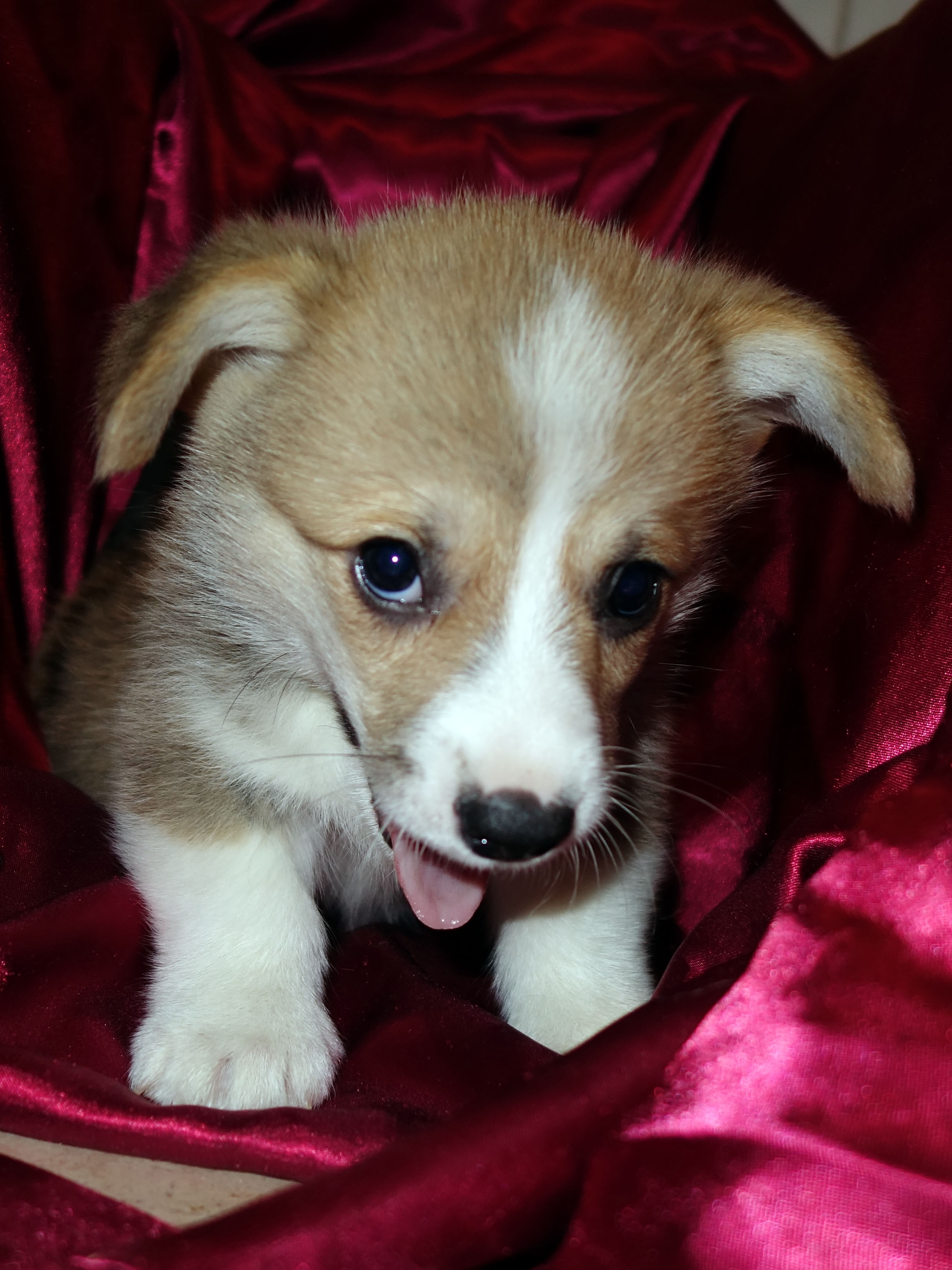 Элвис – триколорный мальчик, от братьев отличается чуть меньшими размерами и более компактным корпусом. Да и вообще он весь компактнее – плечистый, широкогрудый, и голова в типе: короче и шире шипец, более крутой стоп. Такой мячик, прыгучий и упругий. Окрашен нарядно, в очности как братье – их вообще по мордочкам различать трудно. Еще, судя по всему, будет обладателем роскошных больших ушей – украшения любого уважающего себя корги. И нравом он тоже как мячик, веселый, подвижный, игривый.