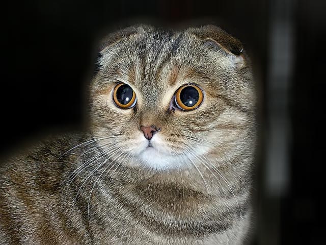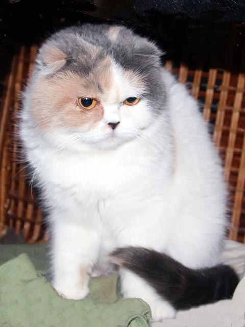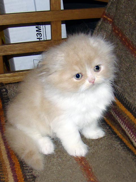 Котята все крепенькие, прекрасно одетые — густая-прегустая плюшевая шерстка, с мордочками очень породными и миловидными, у фолдиков залом ушей плотный. Родилось четыре котенка, два страйта, котик и кошечка, оба биколоры, белый с голубым, и два фолда — кошечка биколор (черный табби с белым), и кот — вообще роскошный. Он не просто фолд очень красивого биколорного окраса — абрикосово-кремовый с белым, он еще и хайленд-фолд!